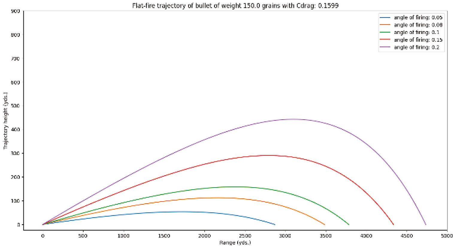 RESULTS: It is observed that an increase in the bullet weight and consequently the sectional density lowers the CD. As expected, it is seen that the bullet with the highest drag (B0) has the shortest range and lowest apogee, while lower drag bullets fly further and higher. The crossover of trajectories is observed at ~30° angle of gun elevation, which implies that the maximum range is not achieved when fired at 45°, as is the case with vacuum trajectories. Flat-fire approximation of the point-mass model was also solved to observe trajectories and crosswind deflections of the bullets when fired at <5° angles of elevation.