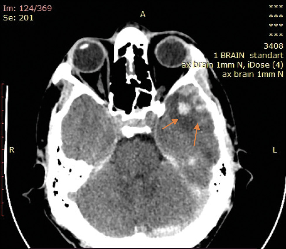 Рис. 1. Мультиспиральная компьютерная томография головного мозга: очаги ушиба головного мозга (стрелки) в полюсных отделах левой височной доли на аксиальном срезе.