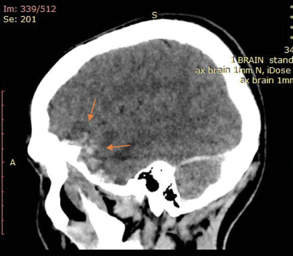 Рис. 2. Мультиспиральная компьютерная томография головного мозга: очаги ушиба головного мозга в полюсно-базальных отделах левой височной доли (стрелки) на сагиттальном срезе.