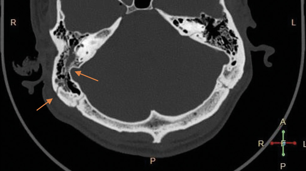Рис. 3. Мультиспиральная компьютерная томография головного мозга: перелом пирамиды правой височной кости с переходом на заднюю стенку наружного слухового прохода, кровоизлияние в ячейки сосцевидного отростка справа, в антрум и барабанную полость справа (стрелки) на аксиальном срезе.