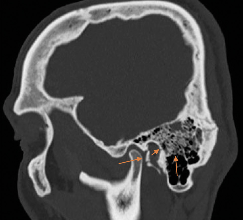 Рис. 4. Мультиспиральная компьютерная томография головного мозга: перелом пирамиды правой височной кости с переходом на заднюю стенку наружного слухового прохода и кровоизлияние в ячейки сосцевидного отростка, в антрум, барабанную полость справа (стрелки) на сагиттальном срезе.