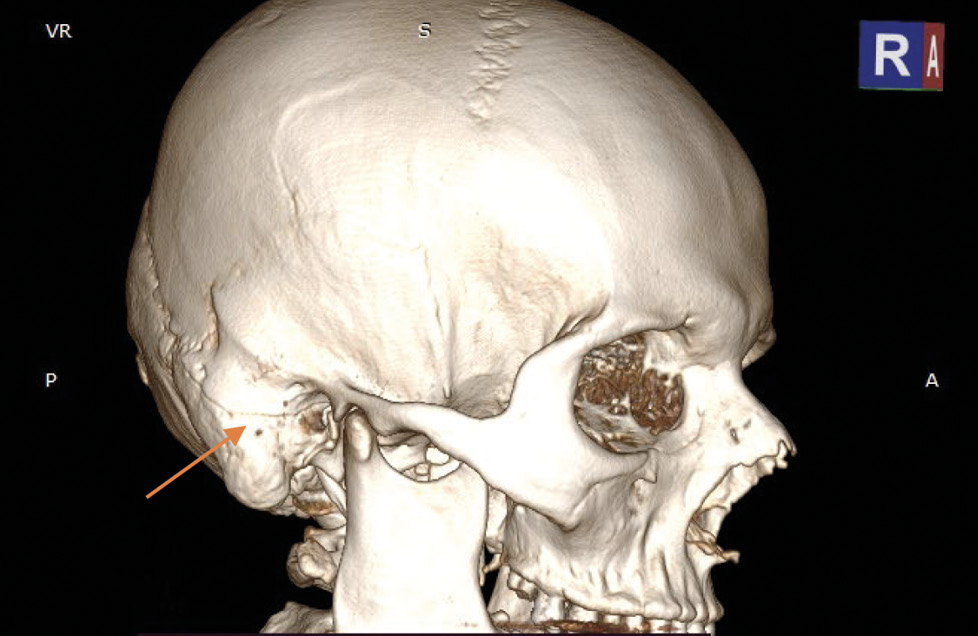 Рис. 5. Мультиспиральная компьютерная томография головного мозга: перелом сосцевидного отростка правой височной кости с переходом на заднюю стенку наружного слухового прохода (стрелка) на 3D-модели.