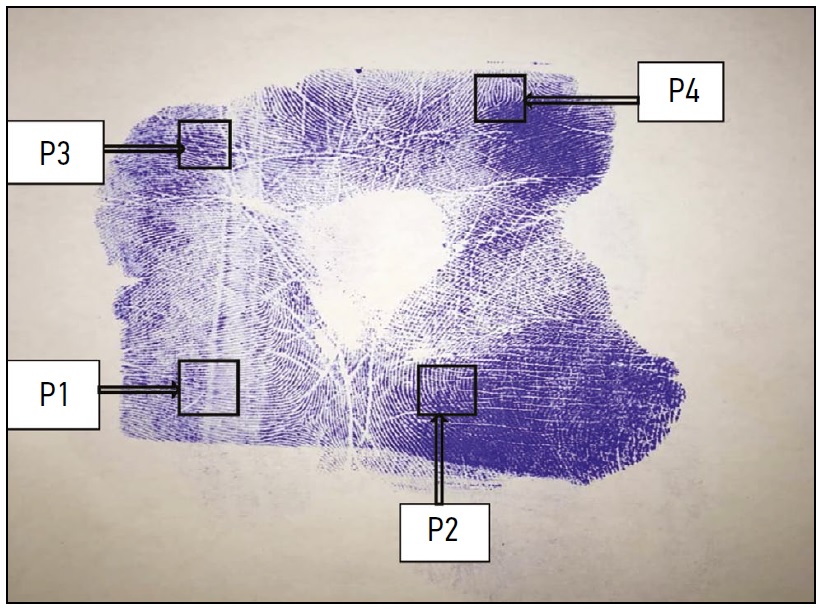Fig. 1. Designated areas on the palmprint that were analysed for the palmprint ridge density.