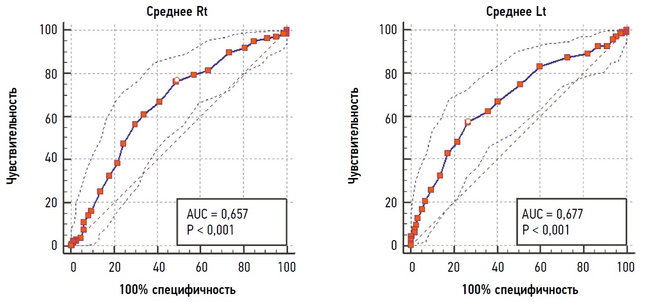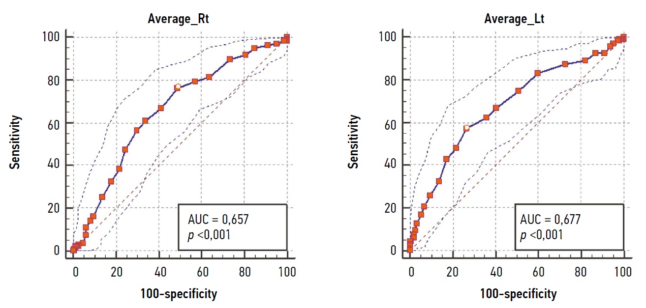 Fig. 2. ROC curve for average palm print ridge density of each hand, Rt — right hand, Lt — left hand. AUC — area under the curve, p <0.01 — significant differences.