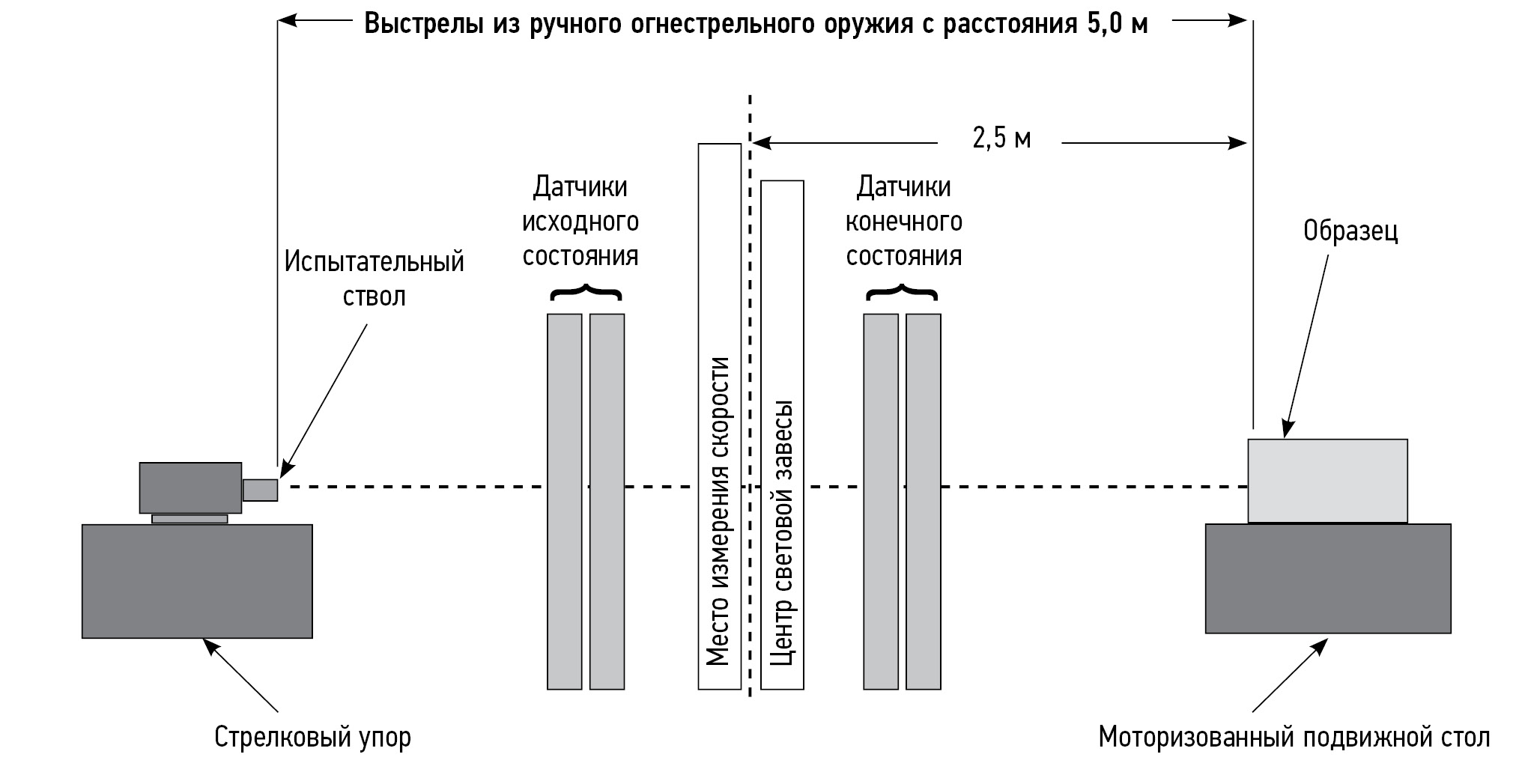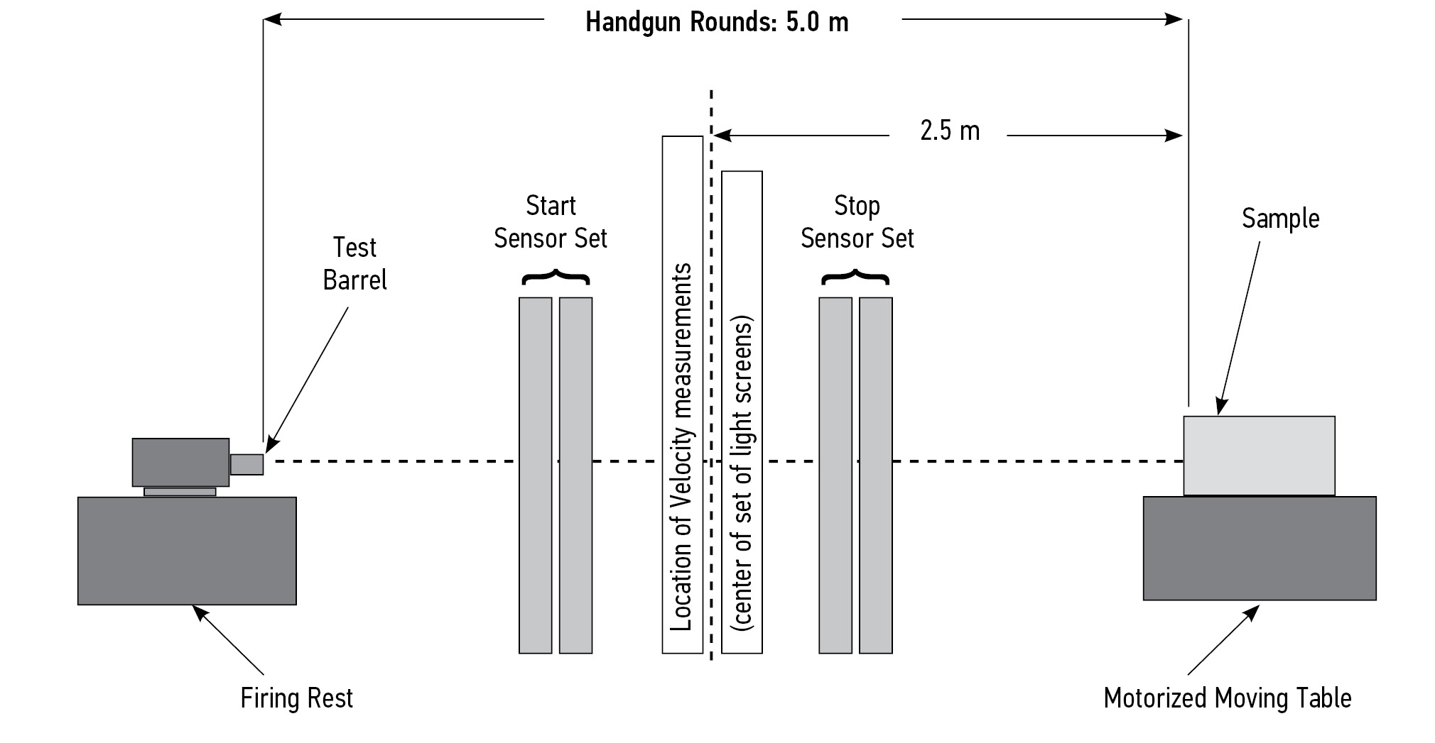 A sample of 12 specimens underwent testing within the indoor environment of the Ballistics Range. The firing was done at a fixed 5 m distance from the target, with an IR light gate positioned 2.5 m from the barrel’s muzzle end to measure initial projectile velocity (gate data transmitted to a computer via Ethernet, with velocity calculations conducted through BMS Test Velocity LG software). A laser light integrated into the firing setup facilitated precise targeting of the sample’s center. The firing setup is visually represented in Figure 2 for reference.