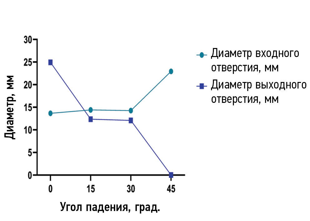 RESULTS: Examination of the fracture pattern revealed significant damage at both entry and exit holes for a 0° impact angle. As the impact angle increased, the exit hole diameter progressively decreased, culminating in no perforation at a 45° angle. This trend correlated with fracture patterns near entry and exit holes, along with energy dissipation at the impact site corresponding to the impact angle.