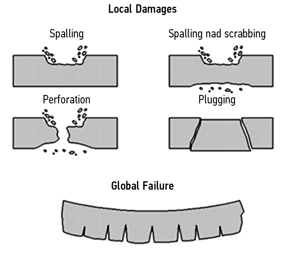 Forensic investigators use different methods to establish the forensic significance of fired projectiles. These methods help them in conducting effective investigations to support legal proceedings. When a projectile hits a target, the outcomes are contingent on the encountered barriers. The effects of one or more interactions between a projectile and barriers that prohibit its penetration at potentially lethal velocities for vulnerable components constitute the terminal ballistics of a projectile. The primary goal of a barrier is to decelerate the projectile, achieved through fragmentation or deformation. The projectile’s velocity is partially influenced by factors including propellant type, ignition, and subsequent high-pressure gas expansion that propels the projectile from the weapon’s barrel at a substantial muzzle velocity [1, 2]. Understanding the mechanical behavior of solids is essential to establish a foundation for selecting barrier parameters crucial in defining terminal interactions [3]. Concrete, showing distinct characteristics under tension and compression, presents a more intricate challenge in ballistic assessment compared to metals. These characteristics help in identifying the firearm used and potential firing locations. Significant differences in the physical properties of metals, concrete, and masonry govern the resisting forces against penetration and the fracture mechanisms leading to perforation. Concrete structures under firearm attacks can experience diverse fracture modes, including complete fracture, penetration, perforation (full penetration), scabbing, spalling, cracking, local plugging, and/or global failure (as shown in Figure 1) [4]. Among these, perforation inflicts the most severe damage, while spalling and scabbing, accompanied by craters at entry and exit points, represent common failure modes [2].