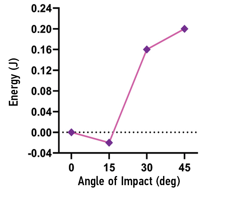 Angle of Impact | Initial Energyi (J) (A) | Impact Energyii (J) (B) | Energy Lossiii (J) (C=A-B) | % Loss of Energyiii, |