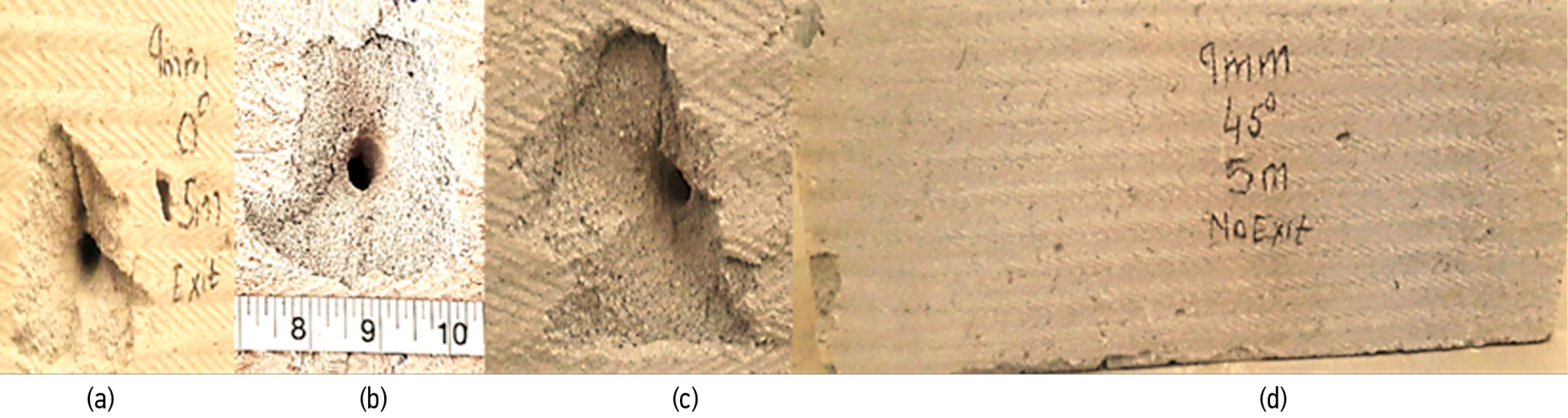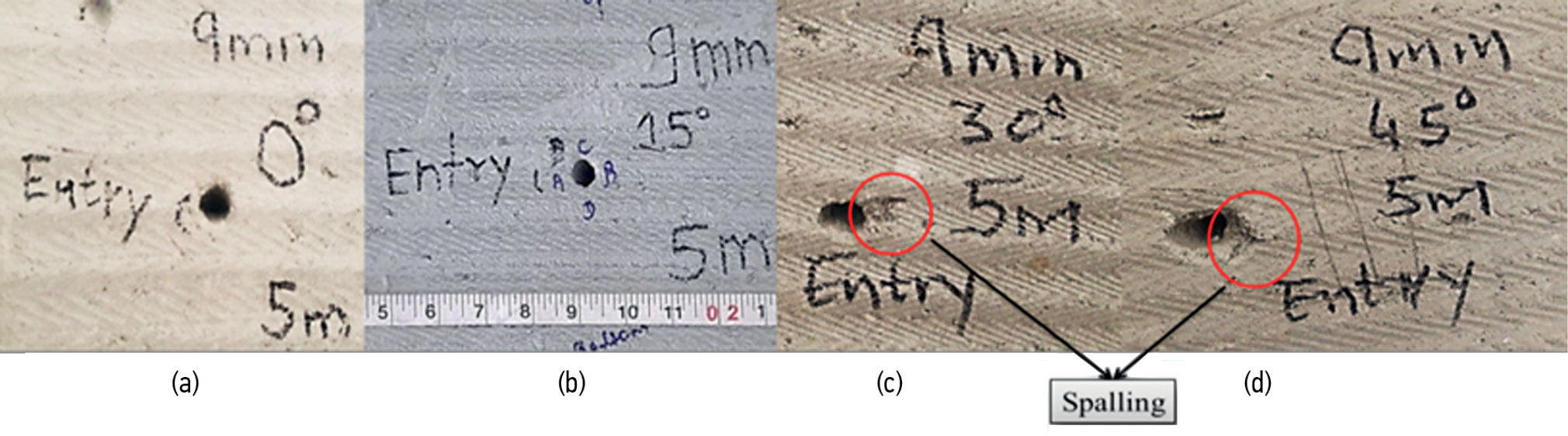 45° | • Penetration and spalling • Maximum loss in impact energy • Minimum bullet tip interaction with the target surface results in the maximum mean diameter for the entry hole | • No back damage/perforation • No exit hole was present |