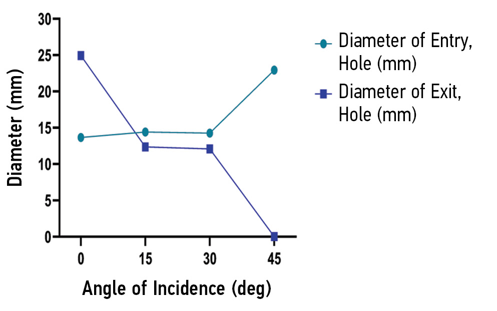 30° | • Penetration and spalling • Visible loss in impact energy • Decreased bullet tip interaction with the target surface compared to 15°, and the mean diameter for the entry hole lies close to that of 15° | • Perforation • Mean diameter of the exit hole is lesser than the mean diameter of the entry hole and lies close to that of 15° |