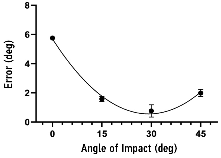 On calculating the error between known and calculated values for the angle of impact, a non-uniform variation becomes evident, with the maximum variation observed at 30° and the minimum at 0°. However, it is interesting to note that the least error occurs at 30°, whereas the highest error occurs at 0°, indicating a deviation from expected behavior. Conversely, angles 15° and 45° show consistent patterns without such anomalies. Employing both linear and non-linear regression on the data and plotting the non-linear regression (Figure 8), it was determined that the absolute error pattern aligned best with a quadratic equation. Utilizing GraphPad Prism 9.3.1, a statistically significant result was achieved through the least-squares fit (R2 value 0.9922).