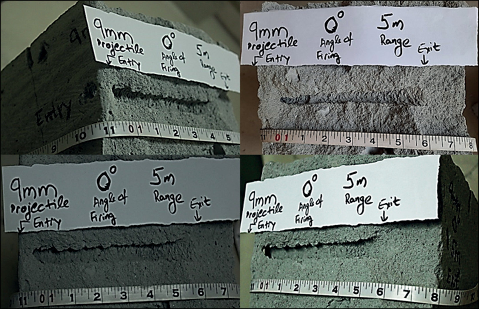 Figure 9 shows the trajectory of the bullet upon impact, entering the fly-ash block and creating a small hole. This happened when fired from a 5m range at a 0° impact angle.