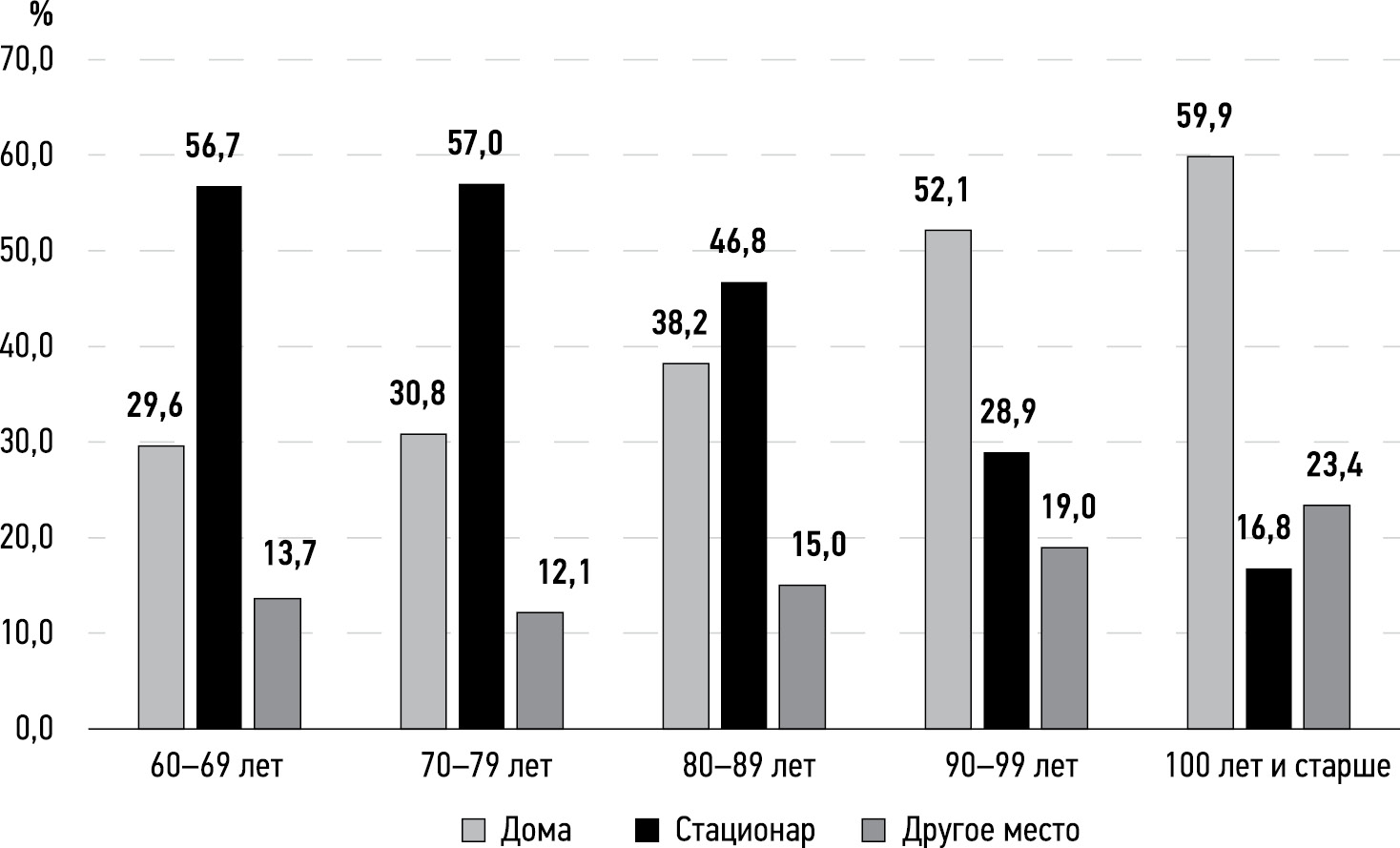 Рис. 1. Доля умерших в стационаре, дома или в другом месте в разных возрастных группах, %.
