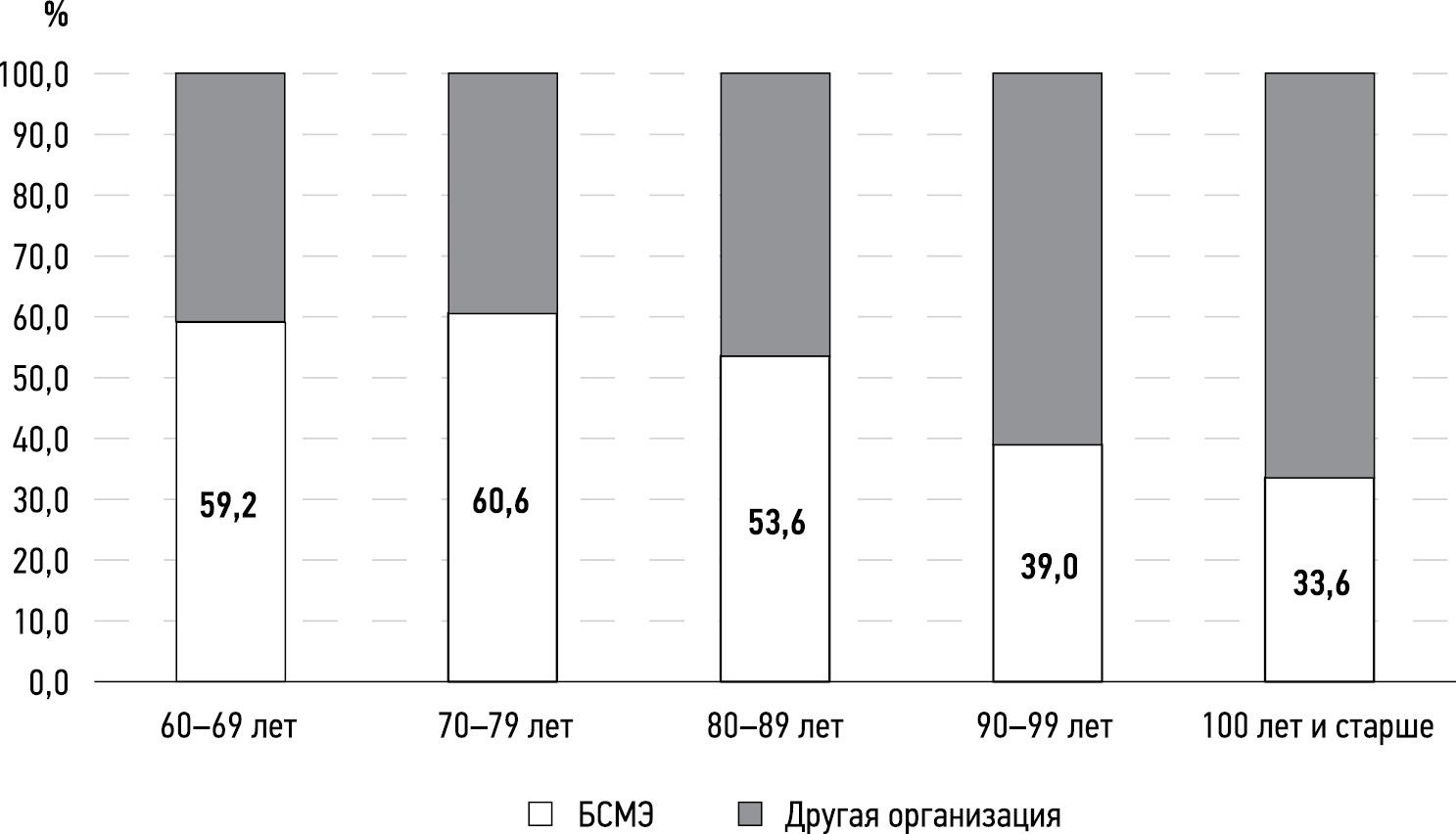 Рис. 2. Доля медицинских свидетельств о смерти в разных возрастных группах, выданных Бюро судебно-медицинской экспертизы (БСМЭ) или другими медицинскими организациями, %.