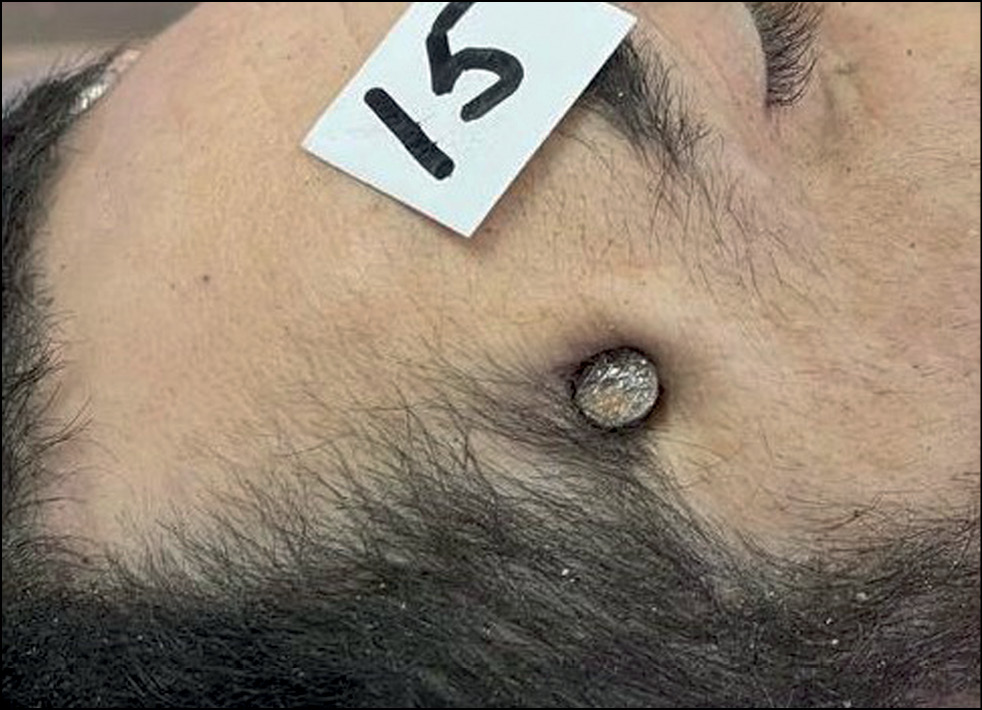 В правой височной области на расстоянии 165 см от подошвенной поверхности правой стопы и 11,5 см правее условной срединной линии имеется рана, из которой выступает инородный предмет из металла серого цвета. Предмет округлой формы, имеет плоскую поверхность диаметром 0,7 см (рис. 1).