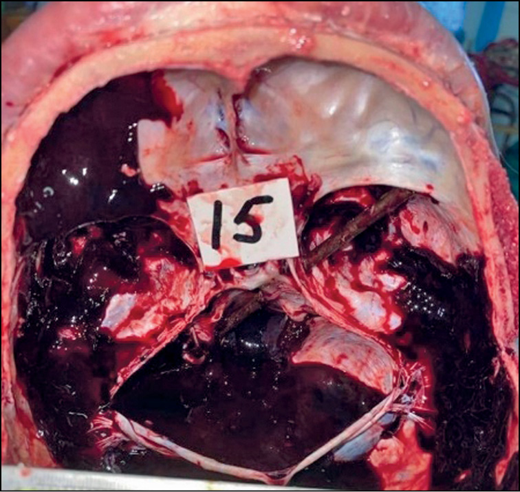Кожно-апоневротический лоскут головы серовато-розоватого цвета, с тёмно-красным кровоизлиянием в височной области справа, в проекции вышеописанной раны. Височная мышца инфильтрирована кровью на площади 2,5×2,5 см. Инородный металлический предмет, находящийся в ране, проникая в полость черепа, образует раневой канал, направленный справа налево, спереди назад и сверху вниз. По ходу раневого канала образован округлый дефект височной поверхности большого крыла правой клиновидной кости; повреждена твёрдая мозговая оболочка в проекции височной доли с образованием щелевидного разрыва длиной 0,5 см; сформировано повреждение вещества правой височной доли головного мозга с развитием обширных тёмно-красных паренхиматозных кровоизлияний; образован сквозной дефект костных структур: передней поверхности пирамиды правой височной кости в области верхушки, толщи костной ткани верхушки пирамиды, правого наружного края тела затылочной кости, верхней поверхности тела затылочной кости; повреждены структуры ствола головного мозга, где обнаруживаются тёмно-красные паренхиматозные кровоизлияния (рис. 2).