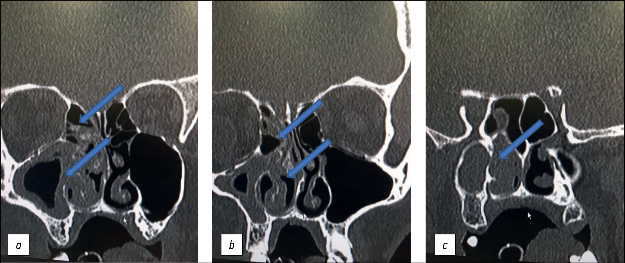 Рис. 2. Тот же пациент. Срезы компьютерной томограммы: утолщение слизистой оболочки верхнечелюстной пазухи с блоком остеомеатального комплекса, утолщение слизистой оболочки клеток решётчатого лабиринта, слизистой оболочки полости носа в переднем (а), среднем (b) и заднем отделе (с) верхнечелюстной пазухи (стрелки).