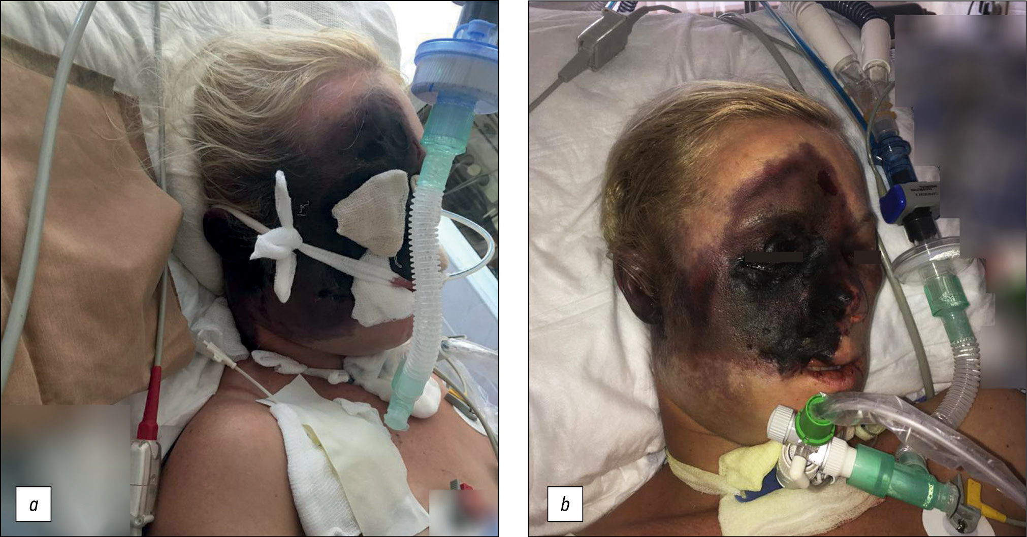 Рис. 5. Тот же пациент. Третьи сутки в отделении анестезиологии и реанимации, седьмые сутки с момента обращения за медицинской помощью (a, b).